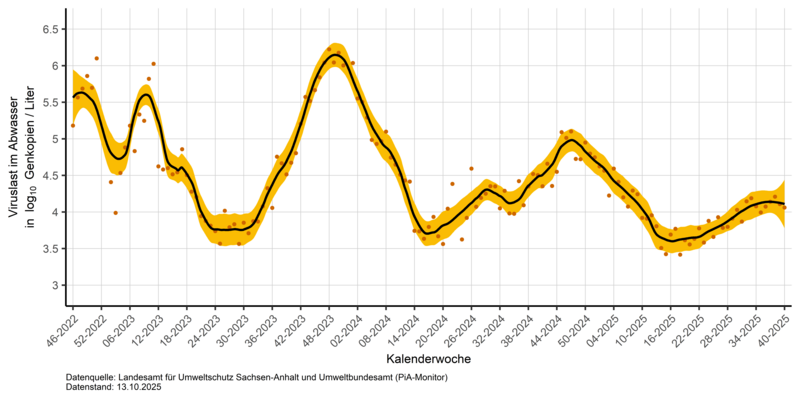 Anhand der normalisierten Daten erfolgen am Robert Koch-Institut (RKI) bundesweite Auswertungen und am LAV Auswertungen für Sachsen-Anhalt, um die SARS-CoV-2-Viruslast im Abwasser und ihre Trendentwicklung einzuschätzen.